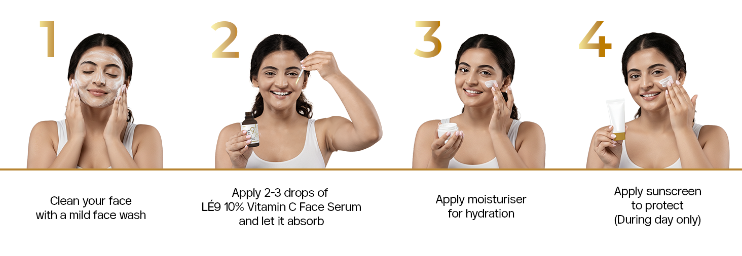 Apply 2–3 drops on clean skin, morning or night. Follow with moisturizer and sunscreen. Visible results in 4–6 weeks.